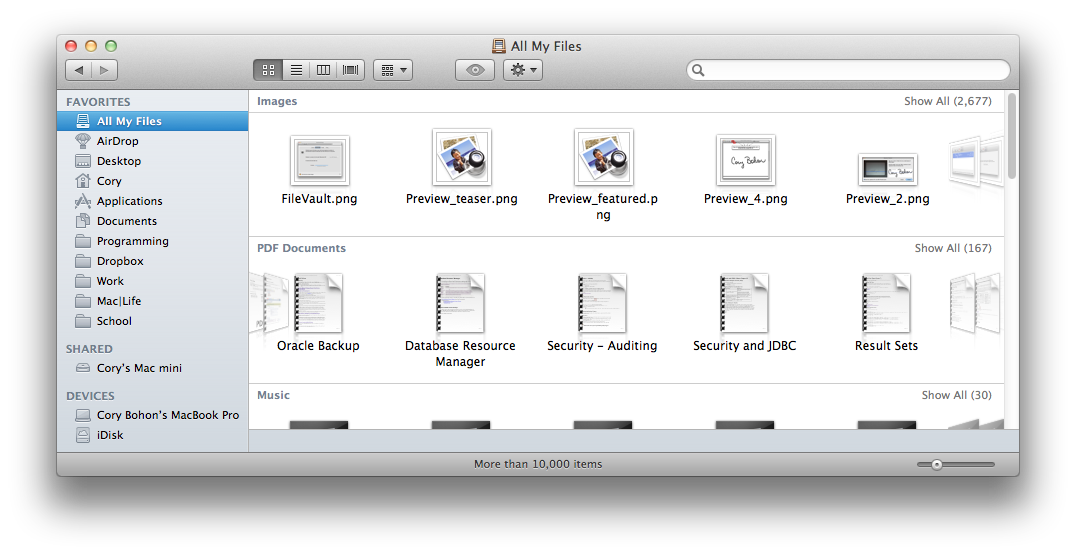 Per Finder è arrivata una nuova possibilità di visualizzazione dei file, infatti ora se si preme Command + 1 con il nuovo Mac OS X Lion si potrà accedere al nuovo tipo di visualizzazione delle icone. Esso prevede una sorta di CoverFlow anche per quanto riguarda i file. Ma oltre a questo saranno divisi in categorie per esempio secondo la tipologia di file.