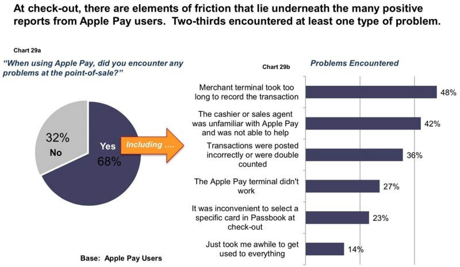 Degli utenti che hanno attivo Apple Pay, quelli che lamentano problemi sono il 68%. Questo rende Apple Pay meno attraente e meno entusiasmante, ma è normale che ci siano dei problemi quando una tecnologia è nuova. Il 48% lamenta i tempi di transazione, dicendo che l’esercizio commerciale ha impiegato troppo tempo per eseguire l’operazione. Il 42% ha lamentato che il servizio alla cassa non conosceva a sufficienza il prodotto Apple Pay. Il 36% ha detto che ci sono stati problemi nelle transazioni. Secondo il 27% degli intervistati il terminale non ha funzionato. Poi ci sono stati altri problemi con partner Apple Pay che non erano ancora attrezzati per ricevere questa forma di pagamento.