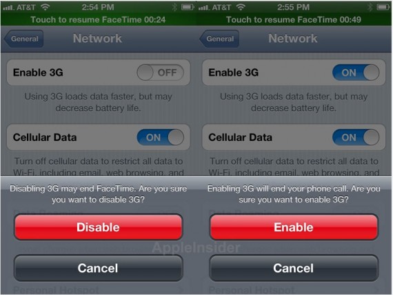 Su quella che al momento è l’ultima versione di iOS, la 5.1.1. , è arrivato un messaggio di avviso che in un certo senso non ha fatto altro che confermare quanto detto. Perciò, qualora disattiviate il 3G  dalle impostazioni dell’iPhone, nel corso di una videochiamata FaceTime in Wi-Fi, vi verrà mostrato il seguente messaggio di avviso: “Disabilitando il 3G terminerà la sessione di FaceTime. Vuoi davvero disabilitare il 3G?”.
