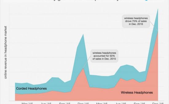 Le nuove cuffiete AirPods avrebbero anche rubato il primato alle cuffie Beats, che mantengono nonostante tutto una percentuale di mercato del 15,4% tra le cuffie wireless. Il calo è significativo per Beats, perchè l’anno scorso sempre nel mese di Dicembre le cuffie della controllata di Apple avevano il 24,1%. Se quindi sommiamo la quota di mercato di Beats e di AirPods, Apple ha quasi il 40% del fatturato online degli auricolari.