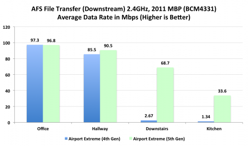 La tabella nell’immagine analizza la quantità di file trasferiti con un MacBook Pro da 2,4Ghz del 2011 collegato all’Airport Extreme di quarta e di quinta generazione. Nelle zone dove funzionava bene il vecchio Airport Extreme il miglioramento è quasi nullo, ma nella terza zona è migliorato veramente molto per non parlare della quarta zona. In conclusione questo esperimento mostra che il nuovo Airport Extreme non migliora tanto dove già prima funzionava bene ma allarga il raggio d’azione e fa in modo che il segnale sia più potente. Klug termina il suo test dicendo che il prezzo dell’Airport Extreme è buono tenendo in considerazione la qualità migliore del prodotto rispetto alla concorrenza.