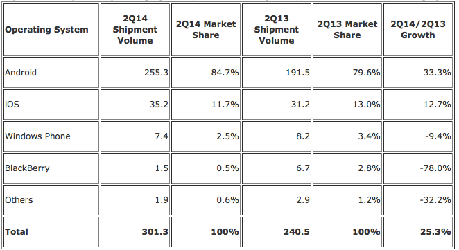 Giovedì scorso sono usciti i nuovi numeri di IDC che ci danno un’indicazione su come è diviso il mercato dei sistemi operativi per smartphone. Questi numeri si riferiscono alle vendite globali in tutto il mondo nel secondo trimestre del 2014. È interessante notare prima di tutto che le vendite di sistemi operativi su smartphone sono cresciute in media del 25% rispetto allo stesso trimestre dello scorso anno, superano le 300 milioni di unità vendute.