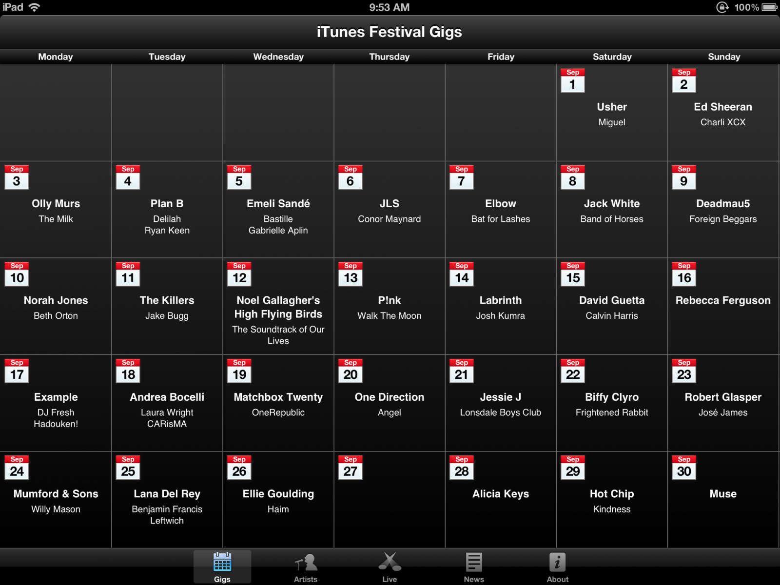 L’applicazione è molto completa e utile per chi in questo momento non è a Londra a seguire i propri cantanti preferiti. Tra i vari abbiamo: P!NK, Muse, Hot Chip, Deadmau5, David Guetta, Usher, Jack White, Norah Joan, Alicia Keys, Ellie Goulding, The Killers e tanti altri per 30 giorni di musica Live.
