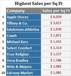 Apple rimane sempre al vertice della classifica delle compagnie Retail con più profitti per negozio negli Stati Uniti. La classifica mette in competizione le vendite in dollari di ogni società e le rapporta al numero di piedi quadrati di negozi a disposizione. Questa classifica si è dimostrata molto positiva per Apple e per i suoi Apple Store.