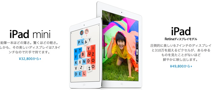 Il prezzo di iPad e iPad Mini erano rispettivamente: 42.800 e 28.800 yen, mentre adesso costano 49.800 e 32.800 yen. L’aumento di prezzo corrisponde a 40$ per iPad Mini e 70$ per iPad. Il prezzo di iPad Mini corrisponde a 329$, mentre il prezzo di iPad corrisponde a 492,87$. I prezzi sono in linea con quanto richiesto nello store americano.