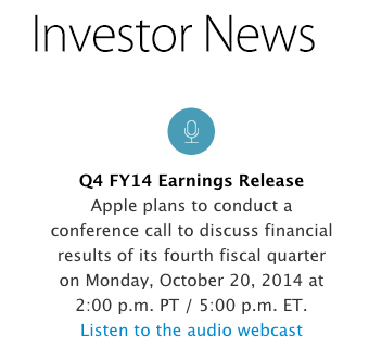 Apple ha comunicato che l’annuncio per i risultati del quarto trimestre fiscale sarà il 20 Ottobre. Il quarto trimestre fiscale è il terzo trimestre del 2014 nel calendario. Come al solito i risultati saranno annunciati a borse chiuse: alle 22.30 in Italia. Seguirà una conference call che inizierà alle 23 sempre ora italiana.