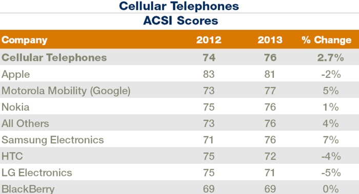La soddisfazione dei clienti, registrata dalla ASCI (American Customer Satisfaction Index), è calata da 83% a 81%. Questo significa che Apple ha perso 2 punti nella classifica della soddisfazione dei clienti, pur mantenendo la prima posizione nella classifica. Alle spalle di Apple ci sono Motorola che ha guadagnato 5% arrivando a 77%, Nokia che ha guadagnato l’1% arrivando a 76% e Samsung che ha registrato il miglior incremento di soddisfazione in classifica con un +7% rispetto all’anno scorso, arrivando però a 76%.