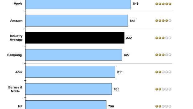 J.D. Power ha realizzato la classifica della soddisfazione dei clienti che possiedono un tablet da meno di due anni. Il risultato è un mix di performance del dispositivo, stile, design, caratteristiche tecniche, e prezzo. La battaglia è molto stretta tra Apple e Amazon che sono ai primi due posti e sono sopra la media di mercato. Apple ha ottenuto un totale di 848 punti su un totale possibile di 1000 punti. Amazon ha solo 7 punti di distacco arrivando ad 841 punti. Samsung che è alla terza posizione, ha punteggio 827.