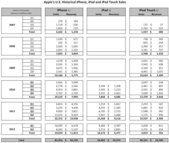 Nella tabella riportata si vedono i dati di vendita per gli Stati Uniti. Apple ha venduto quasi 86 milioni di iPhone da quando ha cominciato a produrlo nel 2007, mentre globalmente ne sono stati venduti 250 milioni. Per iPad invece le vendite ammontano a 34 milioni che sono quasi la metà delle vendite globali in tutto il mondo.