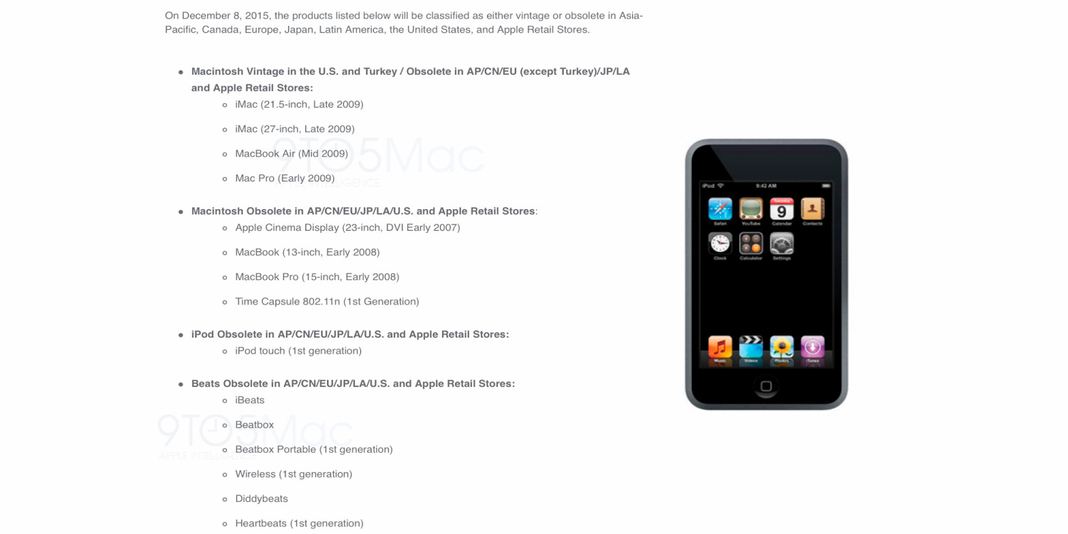 Apple non fornisce supporto tecnico a vita sui suoi prodotti, alcuni di questi vengono declassati ad obsoleti e non vengono più riparati da Apple. In Dicembre Apple ha già deciso che alcuni dei suoi storici prodotti non verranno più riparati nei suoi centri di assistenza.