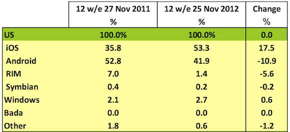 kantar_us_smartphones_nov12Apple negli USA segna il nuovo record del 53,3% del mercato smartphone. È il risultato migliore dall’anno scorso quando invece la quota di mercato era del 35,8%. Il periodo preso in esame è quello da Settembre a Novembre in modo da prendere dentro l’uscita del nuovo iPhone 5 che sicuramente ha fatto lievitare le vendite e quindi la percentuale di mercato. Ma è interessante sapere anche cosa ha fatto Android.