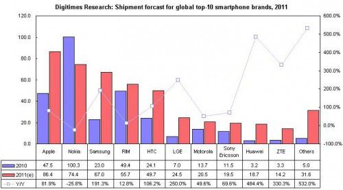 Le previsioni numeriche di Apple hanno un budget di vendite di smartphone proiettate verso l’alto: 86,4 milioni di unità nel 2011, in crescita del 82% da 47.5 milioni di unità nel 2010. Luca Lin , analista per la Ricerca Digitimes, ha dichiarato che le spedizioni smartphone di Nokia nel 2011 si ridurranno a 74,4 milioni di unità provenienti dalla performance di 100 milioni nel 2010.