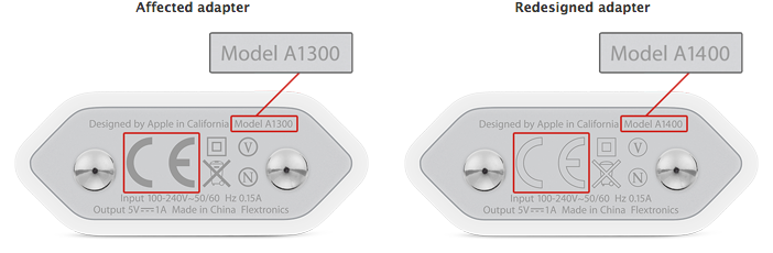 I modelli di adattatori che hanno problemi sono riconoscibili per il numero identificativo: A1300 che è il modello di adattatore USB utilizzato per iPhone 3GS, iPhone 4, iPhone 4S venduti tra l’Ottobre 2009 e il Settembre 2012. Per avere la sostituzione è sufficiente andare in un negozio Apple, o partecipare al programma di sostituzione di Apple.