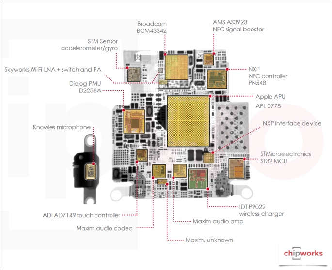Sembra che si tratti di un concentrato di tecnologia da 26 mm x 28 mm. C’è una unica scheda madre con tutti i componenti attaccati. Il processo di produzione per il processore sarebbe quello per i processori da 28 nm di Samsung. Il processore da 28nm è utilizzato anche per iPhone 5S mentre i più nuovi iPhone 6 e iPhone 6 Plus utilizzano processori da 20 nm.