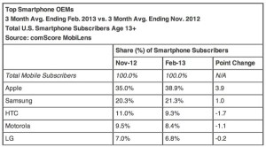 comScore ha pubblicato i suoi risultati sulle vendite di smartphone negli Stati Uniti nel periodo compreso tra Dicembre e Febbraio. Gli smartphone Apple hanno guadagnato un 3,9% di vendite. Questo risultato è relativamente inaspettato perchè è vero che questo periodo comprende il periodo natalizio, però è anche vero che a Febbraio sono passati quasi 4 mesi dal lancio. Negli Stati Uniti si è passati dal 35% di vendite del trimestre che si chiudeva a Novembre al 38,9% di vendite nel trimestre che si è concluso a Febbraio. Al secondo posto c’è la solita rivale Samsung. Samsung ha il 21,3% di vendite del mercato, in crescita dell’1% rispetto al trimestre precedente. Invece HTC, Motorola e LG perdono tutte.