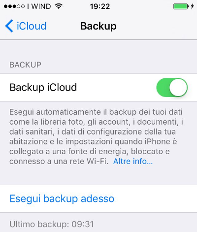 Quando attivi Backup iCloud uscirà questo messaggio: