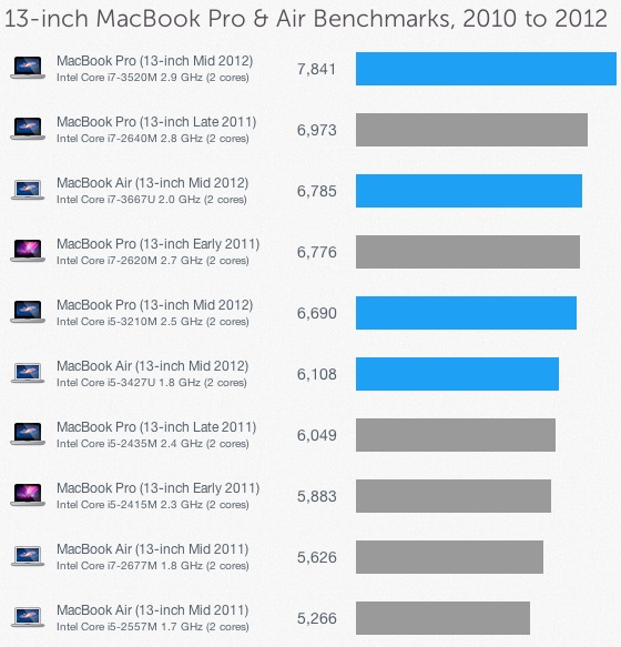 La settimana scorsa avevamo pubblicato i benchmarks del MacBook Pro 15 pollici Retina [link] ottenuti con Geekbench 2 da Primate Lab. Questa settimana sono arrivati i risultati anche per il MacBook Pro da 13 pollici che ricordiamo è stato migliorato dal punto di vista hardware circa una settimana fa. Il nuovo MacBook Pro da 13 pollici ottiene un punteggio più alto di quello di prima di circa il 10-15%.Ma con la stessa percentuale ottiene un punteggio migliore anche dell’attuale MacBook Air 13 pollici. Questo risultato è molto positivo per il MacBook Pro. Per chi fosse incerto su quale modello di portatile comprare, questo articolo sarà utile nella scelta. I risultati migliori arrivano per due fattori principali, la velocità del processore che è aumentata e l‘architettura del processore Ivy Bridge che è più veloce.
