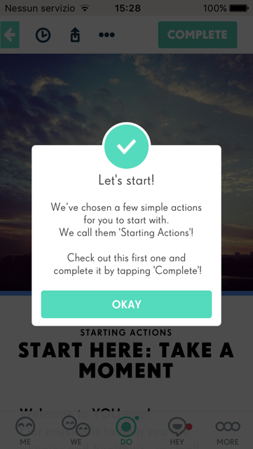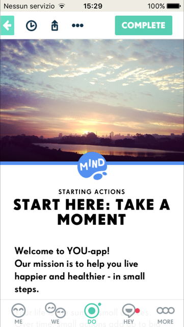 Veniamo alla sezione più importante, quella intorno alla quale ruota tutto il progetto e il concetto base di You-App: “Do“, ovvero la tua piccola azione quotidiana nel percorso del benessere personale. La prima che viene suggerita è quella di scattare una foto che fermi un momento particolare della giornata.