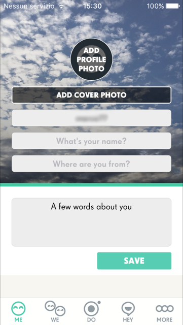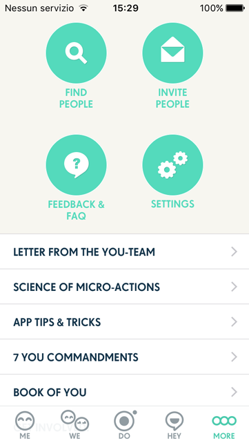 Quando entri in You-App, questa è la schermata che ti si presenta (vedi immagine sotto), dove salta subito all’occhio il menù nella parte bassa dello schermo, con cinque funzioni di base: Me, We, Do, Hey e More.