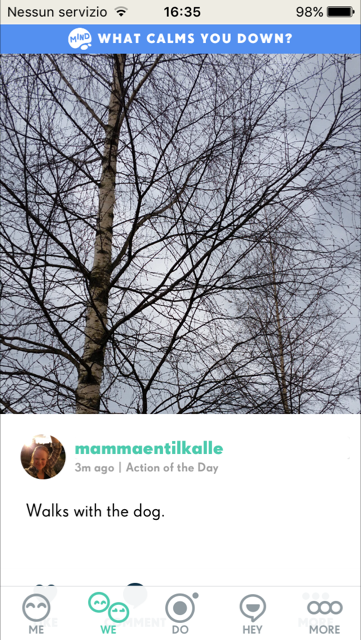 Dovrai premere il pulsante “Complete” per accedere alla macchina fotografica e scattare, la foto è modificabile con effetti tipo instagram, e potrai poi aggiungervi anche un tuo pensiero personale. Questa è la prima delle micro-azioni che ti vengono proposte, ne seguiranno altre come “Cos’è che ti fa felice”, “Che cosa ti fa rilassare” ecc.