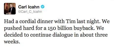 Inizialmente il programma di buyback di Apple era per un ammontare complessivo di 10 miliardi di dollari quando era stato annunciato a Marzo 2012. Ma ad Aprile del 2013 Apple ha cambiato la sua linea annunciando un buyback di 60 miliardi di dollari. Ichan continua a pensare che il prezzo delle azioni sia troppo basso.