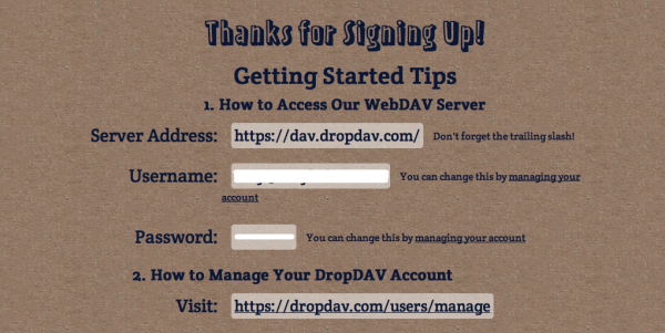 DropDAV vi offre un account gratuito per i primi 14 giorni, successivamente avrà un costo di 5$ al mese. Per registrarsi è sufficiente andare sul sito DropDAV.com. Una volta registrati si verrà connessi a Dropbox dove DropDAV e Dropbox verranno collegati insieme. Quello che bisogna segnarsi sono il Server, l’Username e la Password. Queste sono le 3 informazioni che poi vi verranno chieste da WebDAV.
