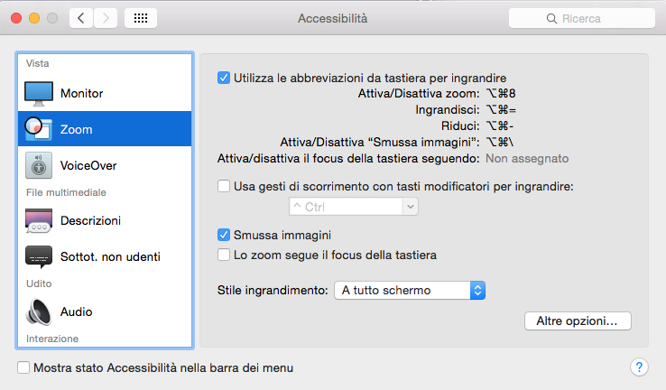 Sul Mac è facile accedere allo zoom, se si sa come fare. Apple offre diverse possibilità di utilizzo dello zoom, tutte si trovano nella sezione: Preferenze di Sistema. Una volta aperto troverete nell’angolo in basso a destra una sezione che si chiama Accessibilità. A questo punto dovete selezionare la finestra Zoom. Dovete mettere la spunta sulla prima voce: “Utilizza le abbreviazioni da tastiera per ingrandire“. Questa opzione dovrebbe essere sempre attiva, perchè è difficile che con le combinazioni di tasti offerte da Apple si possa attivare qualche zoom per errore. In ogni caso avete sempre una scorciatoia per disattivare in velocità lo zoom, come viene indicato dalle opzioni offerte da Apple.