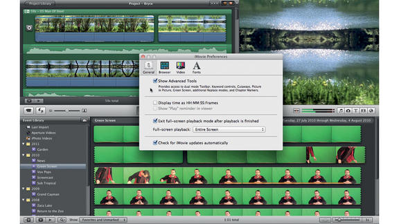 Per prima cosa bisogna che il video con la persona che parla in primo piano sia realizzato con uno sfondo o verde o blu, di quelli classici che si vedono quando si registrano i programmi televisivi. Questo permette al programma di riconoscere la persona in primo piano. A questo punto dobbiamo accedere alle opzioni avanzate del programma: iMovie > Preferences > General > Funzioni avanzate (la prima casella).