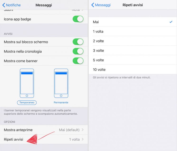 Per modificarla vai in Impostazioni, poi Notifiche e raggiungi Messaggi. In fondo alla schermata troverai la voce Ripeti avvisi, impostata di default a 1 volta.