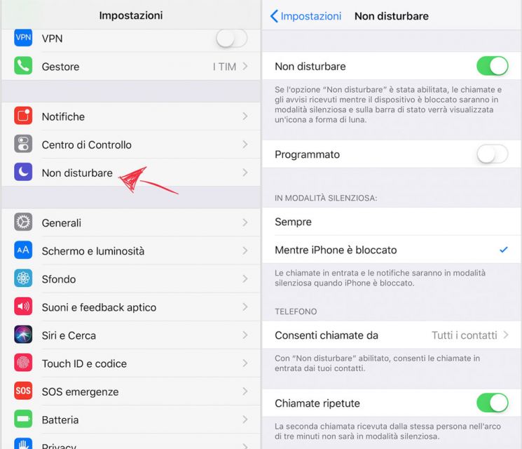 Non si tratta della semplice modalità Silenzioso. Quest’ultima serve infatti ad interrompere qualsiasi tipo di suono, dalla suoneria della chiamata ai clic della tastiera e della fotocamera, mentre Non Disturbare ti permette una gestione più avanzata dei suoni e delle telefonate.