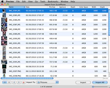Ma in realtà esiste anche un’altro modo per effettuare questa operazione, vi basterà collegare il vostro iPhone e aprire l’anteprima dell’immagine, quindi selezionare File> Importa da [nome del tuo iPhone]. Vi apparirà una finestra che mostra tutte le foto sul telefono, ed avrete la possibilità scorrerle, salvarle su disco o cancellarli dal telefono sia singolarmente che a gruppi di foto.