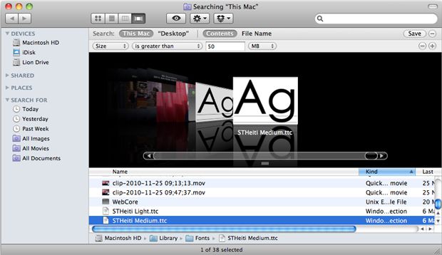 Rimanendo sempre nel Finder cliccate Command+F nella prima finestrella con il menù a tendina mettete: “dimensione” e nella seconda “maggiore di” e si potrebbe partire da 50 MB. Così avrete tutti i file sul vostro computer con un volume maggiore di 50 MB ma state attenti perchè alcuni di questi servono ai processi del Mac, eliminate solo quelli di cui sapete la provenienza.