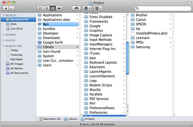 Su Library > Printers o Stampanti troverete tutti i driver per le maggiori marche di stampanti. Non vi servono tutti quei driver considerando che se comprate una nuova stampante i driver sono dentro il cd di installazione o disponibili online.