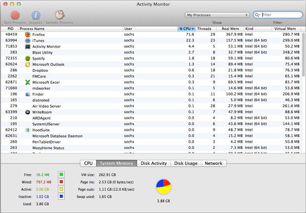 come velocizzare macInoltre video, musica ecc. rallentano molto il vostro computer. Ad esempio solo le animazioni presenti sulle pubblicità delle pagine internet rallentano il computer, quindi se avete tab nel vostro browser inutilizzate è meglio chiuderle, o se avete attivo Visualizer su iTunes è meglio toglierlo (Command-T), insomma tutto quello che non vi serve consuma inutilmente CPU. Infine un ultimo accorgimento: oltre alla CPU rallenta il computer la mancanza di RAM. Se si schiaccia sul bottone Memoria del Sistema sempre dall’applicazione Monitoraggio Attività si ha la torta del consumo di RAM. Se la parte gialla riempie tutta la torta allora è meglio prendere in considerazione l’idea di aggiungere altra RAM.