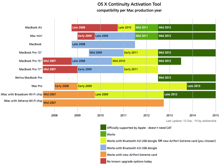 Per il MacBook Air e il Mac Mini del 2012 è sufficiente fare un aggiornamento software. Altri Mac che non hanno il Bluetooth 4.0 richiedono upgrade hardware. Con il nuovo Continuity Activation Tool alla versione 2.0 è finalmente possibile avere Continuity su una serie di Mac per arrivare fino al 2007 per alcuni iMac.