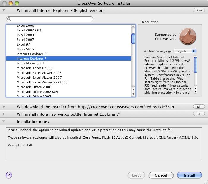 A questo servono le Virtual Machines che tuttavia a parte essere costose sono anche “pesanti” e per utilizzare windows una volta al mese sono eccessive. Poi ovviamente dipende da quello che si deve fare. Così se si vuole semplicemente avere una soluzione intermedia tra una Virtual Machines e i programmi versatili si può optare per Crossover. Questo programma, che è gratis in prova per i primi 30 giorni e poi bisogna pagarlo sui 40$, è scaricabile da internet e si installa senza problemi trascinando l’icona nella cartella applicazioni come per tutti i programmi per mac.