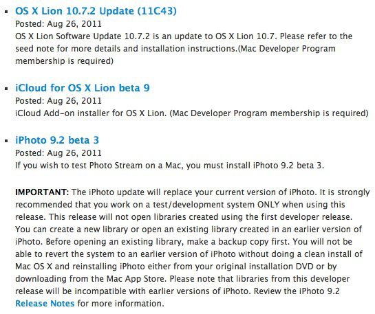 Il seguente post è per informare i nostri lettori che, a distanza di una settimana dall’uscita della beta 6 di iOS 5, Apple ha rilasciato tre nuove built inerenti ad OS X Lion 10.7.2 (11C43), iCloud per OS X Lion beta 9 ed iPhoto 9.2 Beta 3, tutte e tre dedicate agli sviluppatori.