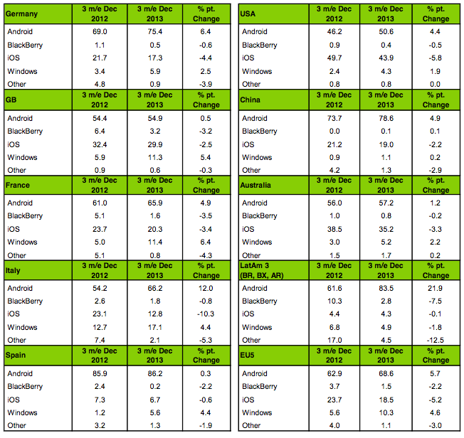 Kantar Worldpanel ha rilasciato un nuovo report, con le vendite smartphone in tutto il mondo nel periodo Ottobre – Dicembre. Quello che emerge è che iOS perde leggermente in molti paesi mentre Android rafforza molto la sua leadership. Android ha finito il 2013 in modo molto forte, con una crescita anno su anno nei principali 12 paesi inclusa Europa, USA, America Latina, Cina e Giappone. Apple nello stesso periodo dell’anno scorso aveva avuto maggiori vendite ma ottiene ottimi risultati in mercati chiave: USA, Gran Bretagna e Cina.