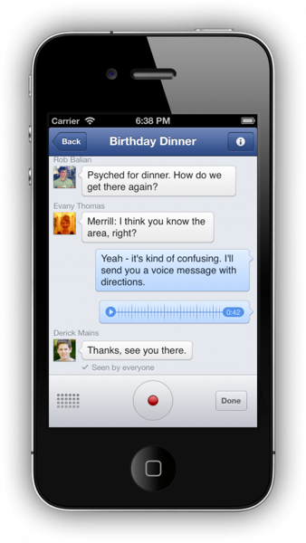 NewImage2L’app di Facebook Messenger vuole essere sempre più completa per i suoi utenti. Adesso oltre al supporto per i messaggi di testo è arrivato anche il supporto per i messaggi vocali. Questa novità sarà molto importante in futuro perchè si amplierà con le chiamate vocali. Se avete installata l’app di Facebook Messenger potrete vedere l’aggiornamento in cui tra le novità è chiaramente scritto che Facebook Messenger avrà la possibilità di supportare le chiamate vocali nelle prossime settimane.