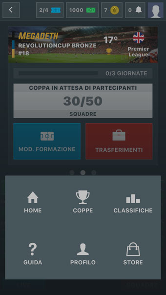 Fantarevolution è un’applicazione molto intuitiva e user friendly, come puoi vedere dall’immagine sopra, c’è un menu che può essere sempre richiamato con un pulsante centrale di colore grigio. Da qui hai accesso alle varie coppe, alle classifiche, al tuo profilo personale, e allo store.