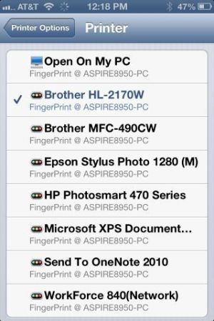 FingerPrint è un software scaricabile per Windows e Mac che permette di stampare i documenti tramite il collegamento cloud. Il funzionamento è molto pratico: il dispositivo è connesso “in cloud” al computer che è connesso con FingrPrint alla stampante. FingerPrint supporta molte stampanti, a differenza di Airprint, e quindi può essere utilizzato molto di più. Il servizio funziona con sistemi cloud come Dropbox o Evernote. Il software automaticamente rintraccia tutte le stampanti connesse al computer e quindi le ripropone sull’iPhone. Una volta aperto il documento si schiaccia il tasto “multifunzione” che porta al collegamento alle diverse opzioni e quindi scegliete Stampa. Da qua vi mostrerà tutte le stampanti connesse al computer.