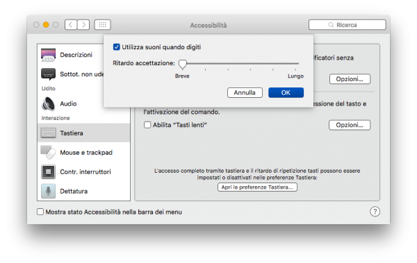 Ok, concludiamo con una funzione un po’ sciocca, anche se il motivo per la quale è stata progettata è abbastanza serio. Per aiutare le persone con ridotta mobilità ad utilizzare la tastiera, l’opzione Tasti lenti fa si che il Mac emetta un suono alla pressione del tasto e un’altro con un filo di ritardo per confermare che il tasto è stato deliberatamente premuto, e quindi registrato. Questi suoni assomigliano proprio a quelli di una vecchia macchina per scrivere, una volta che hai impostato il ritardo al minimo nel solito menù Preferenze di sistema->Accessibilità, sezione Tastiera