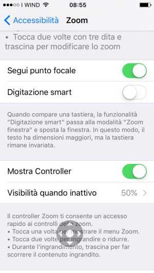 Oppure altra opzione efficace può essere quella di abilitare lo zoom nel menù Accessibilità,  da quel momento non utilizzeremo più lo zoom come tale, ma toccando tre volte su qualsiasi punto dello schermo con tre dita farai comparire il menù dello zoom dove toccando  Scegliere Filtro e successivamente scegliere Luminosità ridotta.accessibilita-zoom-iphone
