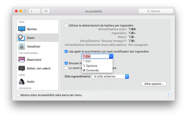 Per cui vai in Preferenze di sistema->Accessibilità->Zoom e spunta l’opzione Utilizza le abbreviazioni da tastiera per ingrandire e Usa gesti di scorrimento con tasti modificatori per ingrandire, e indica quale sarà il tasto assegnato allo zoom. (Control nel nostro esempio)