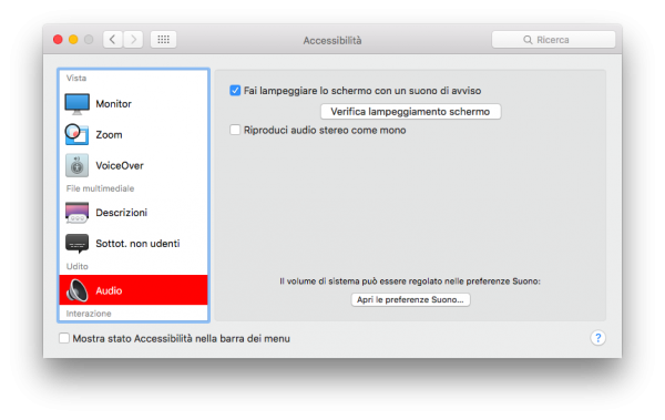 Abilitare questa opzione nella sezione Audio del menù Preferenze di sistema->Accessibilità ti può essere utile quando riscontri problemi audio, ma anche quando ascolti musica con un auricolare solo, e nel frattempo chiacchieri con i colleghi, così non ti perderai le parti di quelle canzoni che hanno, ad esempio, le voci impostate a destra e le chitarre a sinistra.