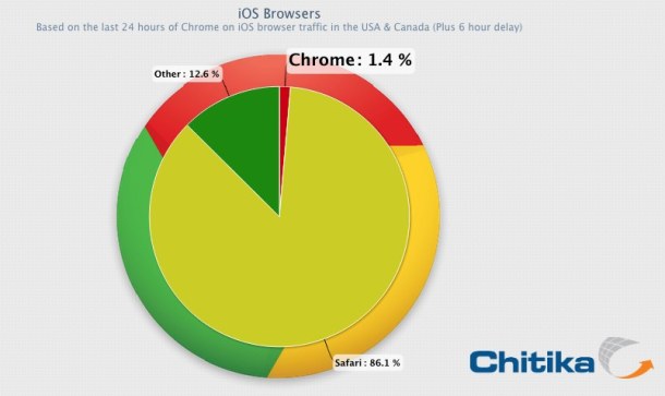 Secondo una ricerca fatta da Chitika il nuovo browser per iOS: Google Chrome, avrebbe raggiunto già quota 1,5%. La cifra non è particolarmente alta e difficilmente arriverà più in alto perchè iOS è un sistema abbastanza chiuso che incentiva molto l’utilizzo del proprio browser Safari; che infatti è a quota 86%. Gli altri browser internet invece arrivano al 13%.