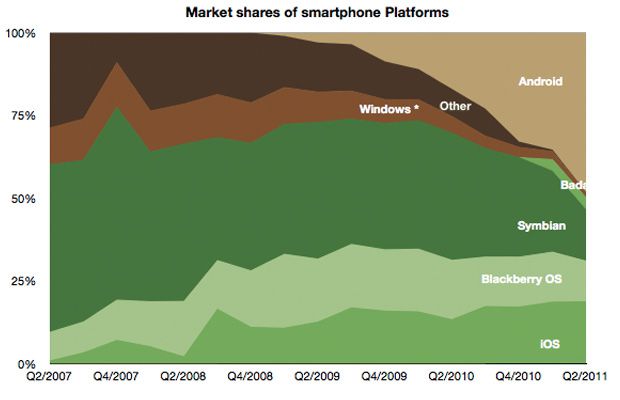 Si può vedere chiaramente che Nokia aveva una leadership indiscussa con oltre il 47% del mercato grazie a Symbian, mentre le altre società si tenevano su buone fasce ma senza brillare. Nel 2008 arriva l’iPhone con il suo sistema operativo privato iOS che quindi cambia il mercato. Infatti Apple in 3 anni è passata dal 2 al 19%. Ma per creare una concorrenza degna di questo avversario molte società si sono rivolte a Google con il suo sistema operativo per telefonia mobile: Android. Stupisce quanto Android sia cresciuta in soli 2 anni. Infatti Android nel 2009 ha iniziato la sua scalata nel mercato per arrivare ai dati odierni del 48% del mercato. Chi ha perso maggiormente sono stati Windows e altri piccoli sistemi operativi perchè le marche grosse di telefonia si sono rivolte ad Android. Nokia con Symbian è passata dal 47 al 16% mentre Blackberry è passata dal 17 al 12%. Flessioni che dimostrano come sistemi operativi nuovi e in grado di aggiornarsi continuamente possano portare a profitti maggiori.