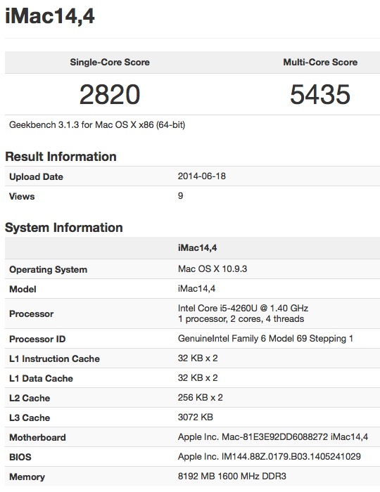 Il punteggio ottenuto nel Benchmark eseguito utilizzando Geekbench è di 2820 per core con un punteggio totale di 5435 (essendo un dual core è circa il doppio). Questo punteggio è solo di poco migliore di quello ottenuto dal MacBook Air 2476/4690 che ha lo stesso chip e rimane abbastanza vicino al punteggio per core ottenuto dall’ex entry level di iMac che ha un punteggio di 2882.