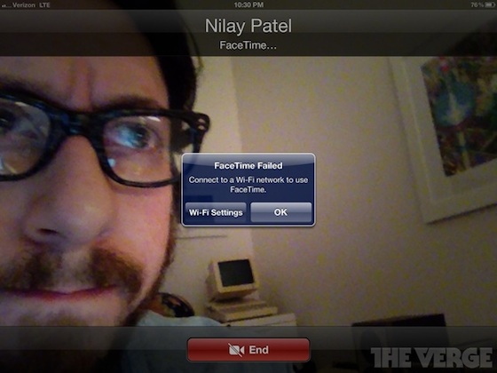 Anche se si collega il nuovo iPad ad una rete LTE di quarta generazione, con prestazioni il più delle volte migliori rispetto a quelle offerta da una connessione Wi-Fi, il risultato non cambia. Coloro che hanno provato ad impiegare FaceTime sull’ultimo tablet della Apple in modalità LTE, ha potuto solamente leggere un messaggio in cui veniva invitato a connettersi ad una rete Wi-Fi per poter usufruire del servizio.