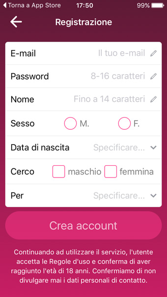 Dopo aver scaricato l’applicazione, occorre registrarsi inserendo un’indirizzo email valido, un nickname, ed aggiungendo una foto. Questi sono i primi passi, e subito dopo puoi scendere più nello specifico, inserendo moltissimi altri dati personali (che ovviamente non sono obbligatori, ma migliorano il tuo grado di “appetibilità”).